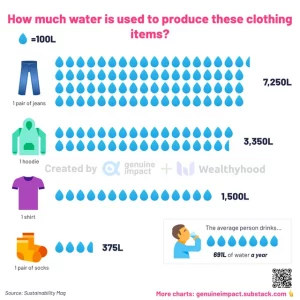 Making one pair of jeans requires a large amount of water, with figures ranging from approximately 1,800 to 3,781 gallons (about 7,000 to 14,000 liters), depending on the source. This water usage is primarily for growing the cotton and for the manufacturing processes, including washing, dyeing, and finishing the denim fabric. Do the math.
